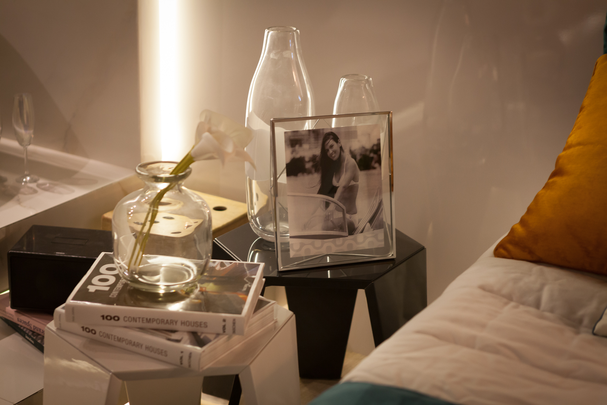 Neste projeto, a integração é a palavra-chave. Concebemos um layout fluido que harmoniza as áreas de descanso, trabalho e bem-estar em um único ambiente sofisticado. A paleta de cores neutras, composta por tons de branco, cinza e madeira clara, serve como tela para elementos vibrantes e texturas ricas, criando um equilíbrio visual e tátil.